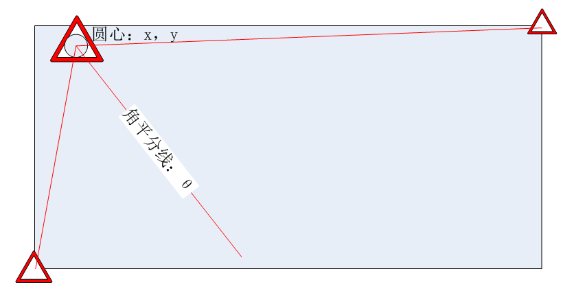 糾偏方法:如上圖所示,三Mark對位會用到三個交點,通常是對角線的兩個端點和客戶指定的一個Mark點。如果客戶有特殊要求,可以按照客戶要求的Mark點進行對位。這種方式比較靈活,選取Mark點的方式也比較多。對角線端點+客戶指定Mark點為例:如上圖,通過直線擬合找到四條直線;通過直線求得對角線的兩個端點;通過擬合圓找到指定的Mark圓心;兩個端點分別與圓心連線;圓心坐標定為(x,y),兩條連線形成夾角的角平分線的角度作為θ;x,y,θ與基準的差值為偏移量。