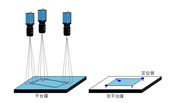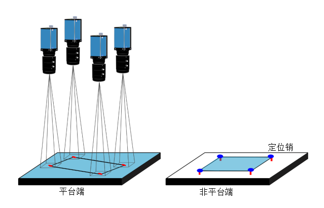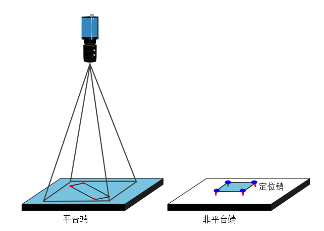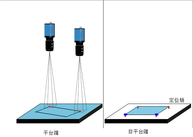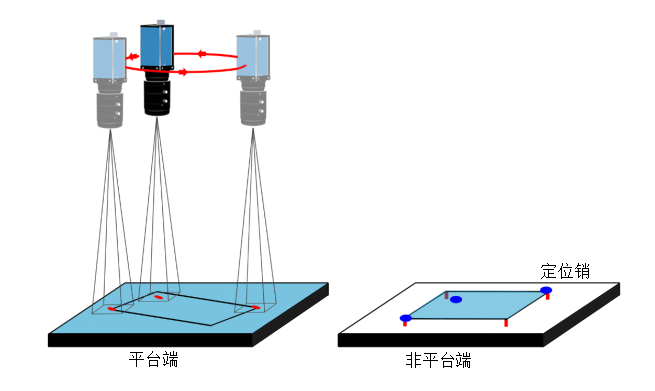 說明:四相機抓邊自對位模型中相機都是在平臺端。四個相機模型的四個相機分別拍攝平臺端矩形產(chǎn)品的四條邊。非平臺端上的產(chǎn)品通過定位銷或其他方式確保來料都是在相對固定的位置,平臺端的產(chǎn)品來料位置不固定。找出四條邊后根據(jù)糾偏算法找到偏移量,根據(jù)偏移量將平臺端的產(chǎn)品貼到非平臺端上。