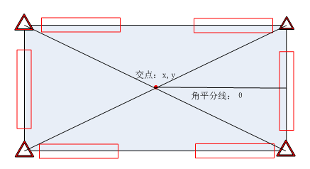 糾偏方法:四Mark對位會用到四個交點,通常是矩形的四個角點。如果客戶有特殊要求,可以按照客戶要求的Mark點進行對位。以矩形的四個角點為例:如上圖,通過直線擬合找到四條直線;找到四條直線的交點即矩形的四個角點;求出對角線的交點坐標定為(x,y);對角線形成夾角的角平分線的角度作為θ;x,y,θ與基準的差值為偏移量。