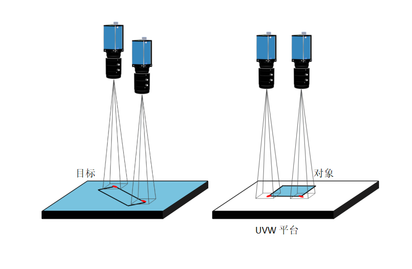 對位目標(biāo)不固定,通過非對位平臺上的目標(biāo)相機獲取坐標(biāo),通過映射關(guān)系轉(zhuǎn)換到平臺上相機中,再計算出對象和目標(biāo)位置偏差,使對準(zhǔn)目標(biāo)位置。