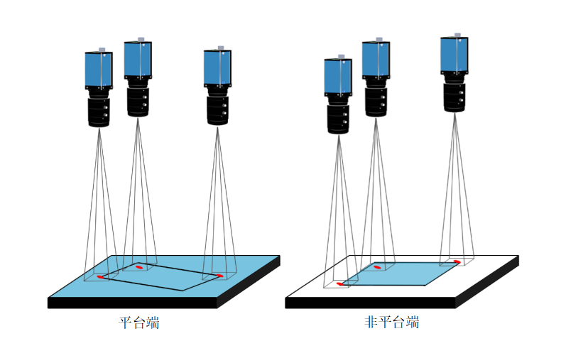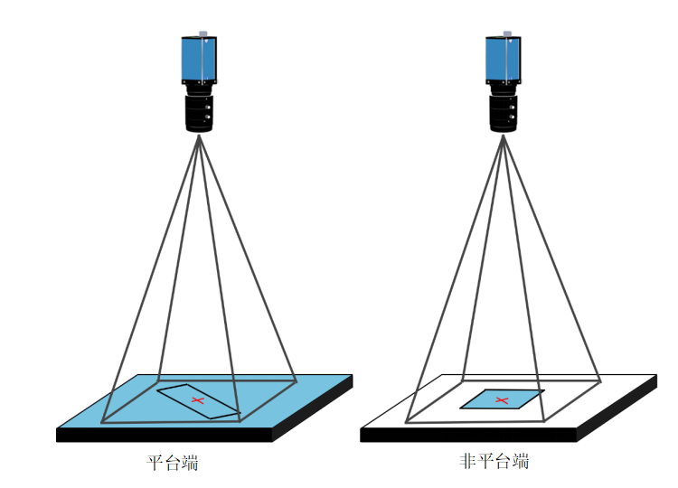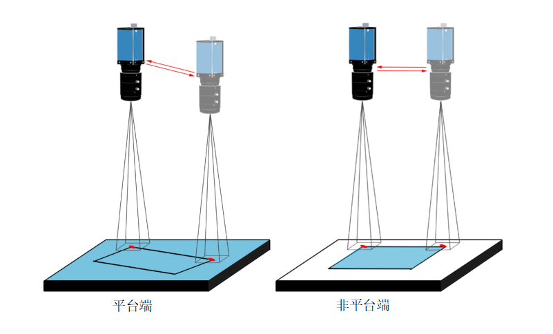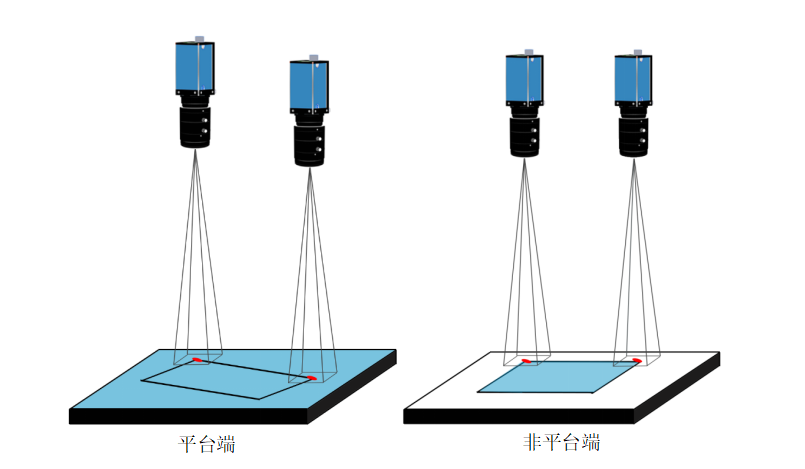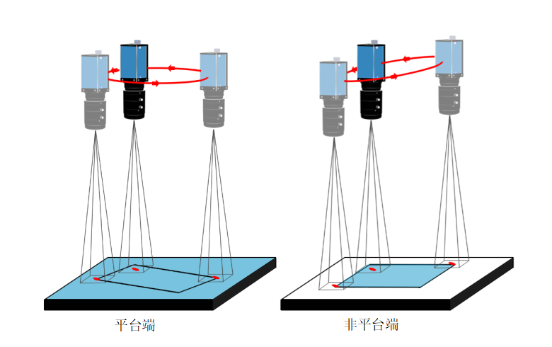 說明:平臺端和非平臺端來料位置都不固定,但是Mark與產(chǎn)品的相對位置固定。平臺端和非平臺端各有一個相機,拍照并找兩張照片中Mark的角度坐標(biāo)差作為偏移量,根據(jù)偏移量和兩相機之間的映射關(guān)系,將平臺端的產(chǎn)品貼到非平臺端上。