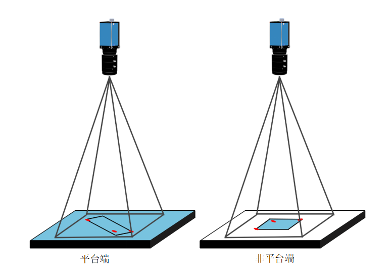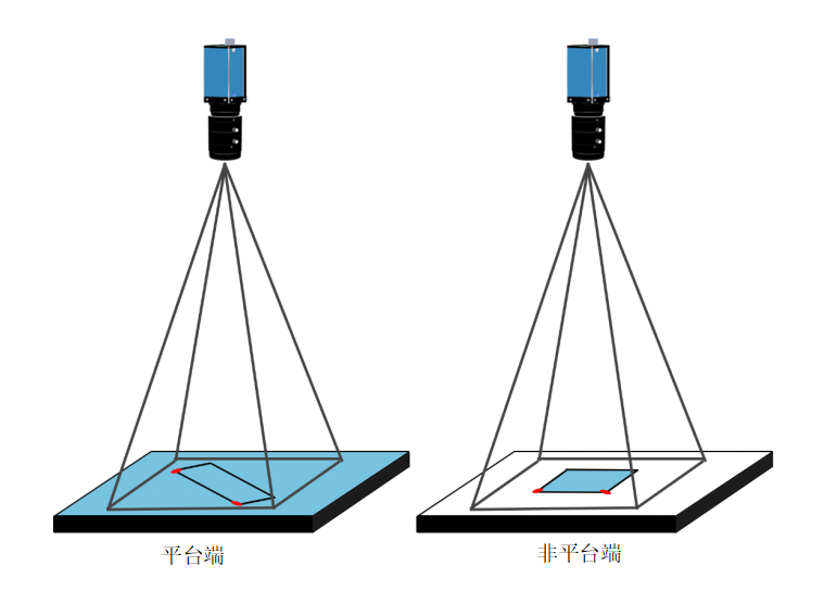 說明:平臺端和非平臺端來料位置都不固定,但Mark與產(chǎn)品的相對位置固定。四個Mark對應(yīng)矩形產(chǎn)品的四個角點。拍攝時確保四個Mark都在相機視野內(nèi)(通常是將產(chǎn)品抓起后再拍攝防止拍完再抓導(dǎo)致產(chǎn)品移動或變形)。根據(jù)糾偏算法找到偏移量。根據(jù)偏移量和兩端相機的映射關(guān)系將平臺端的產(chǎn)品貼到非平臺端上。