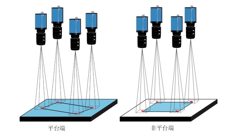說明:八Mark映射對位有單相機和四相機兩種情況(平臺端)。單相機模型拍攝完一個Mark點后移動位置拍攝另一個Mark點,四相機模型的四個相機分別拍攝四個交點。非平臺端和平臺端拍攝方法相同。找出兩端的Mark點后,根據(jù)糾偏算法找到偏移量,根據(jù)偏移量和兩組相機的映射關(guān)系將平臺端的產(chǎn)品貼到非平臺端上。