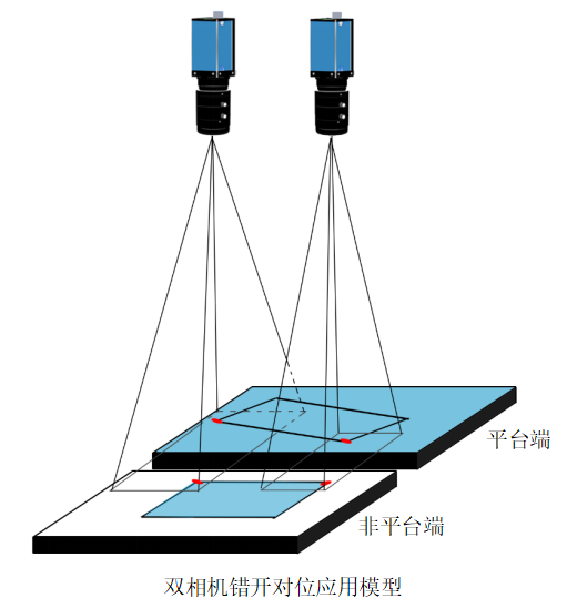 說明:如上圖所示,以雙相機錯開對位模型為例。錯開對位模型近似于映射對位模型。相同點是平臺端和非平臺端的產(chǎn)品都是不固定的,區(qū)別是映射對位需要平臺端和非平臺端各有一組相機,兩組相機通過映射關聯(lián)起來,錯開對位模型中,每個相機都能同時拍攝到平臺端和非平臺端產(chǎn)品的相應Mark點。得到Mark點后。根據(jù)糾偏算法找到偏移量,根據(jù)偏移量將平臺端的產(chǎn)品貼到非平臺端上。