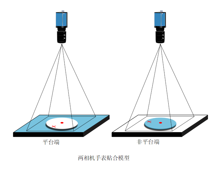 說明:如上圖所示,兩相機手表貼合模型是專門針對圓形產(chǎn)品的應用。類似于四Mark映射對位模型。相同點是平臺端和非平臺端的產(chǎn)品都是不固定的,都是通過四個Mark點定位。區(qū)別是四Mark映射對位是針對矩形產(chǎn)品,兩相機手表貼合模型專門針對圓形產(chǎn)品。得到Mark點后。根據(jù)糾偏算法找到偏移量,根據(jù)偏移量將平臺端的產(chǎn)品貼到非平臺端上。