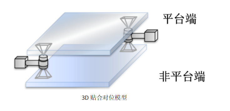 說明:如上圖所示,3D貼合對位有幾種固定的抓Mark方法。上圖的所示方法與雙相機錯開對位相似。平臺端和非平臺端的產(chǎn)品都是不固定的,每個相機通過棱鏡鏡頭,能同時拍攝到平臺端和非平臺端產(chǎn)品的相應Mark點。得到Mark點后。根據(jù)糾偏算法找到偏移量,根據(jù)偏移量將平臺端的產(chǎn)品貼到非平臺端上。