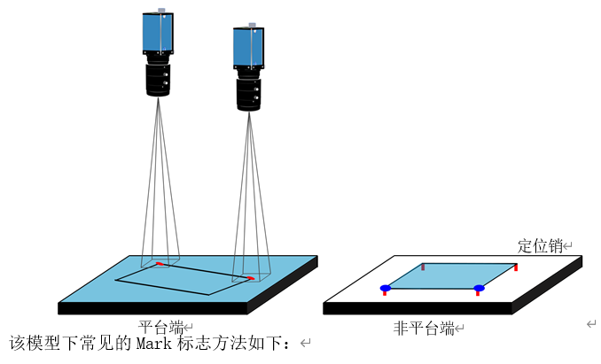 系統(tǒng)中可以使用兩個,三個或四個相機,每個相機都可以同時看到平臺端和非平臺端的對應Mark點(可以通過移動對位平臺,使得Mark點之間有一定的間隔,可以避免Mark點之間干涉)。