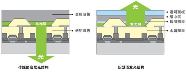 AMOLED也擁有底發(fā)光與頂發(fā)光兩種結構。頂發(fā)光結構中,光線不會受到驅動電路的遮擋,相比底發(fā)光結構擁有更高的開口率,從而在高解析度的應用中具有更大的優(yōu)勢,因此逐漸成為了AMOLED的主流。