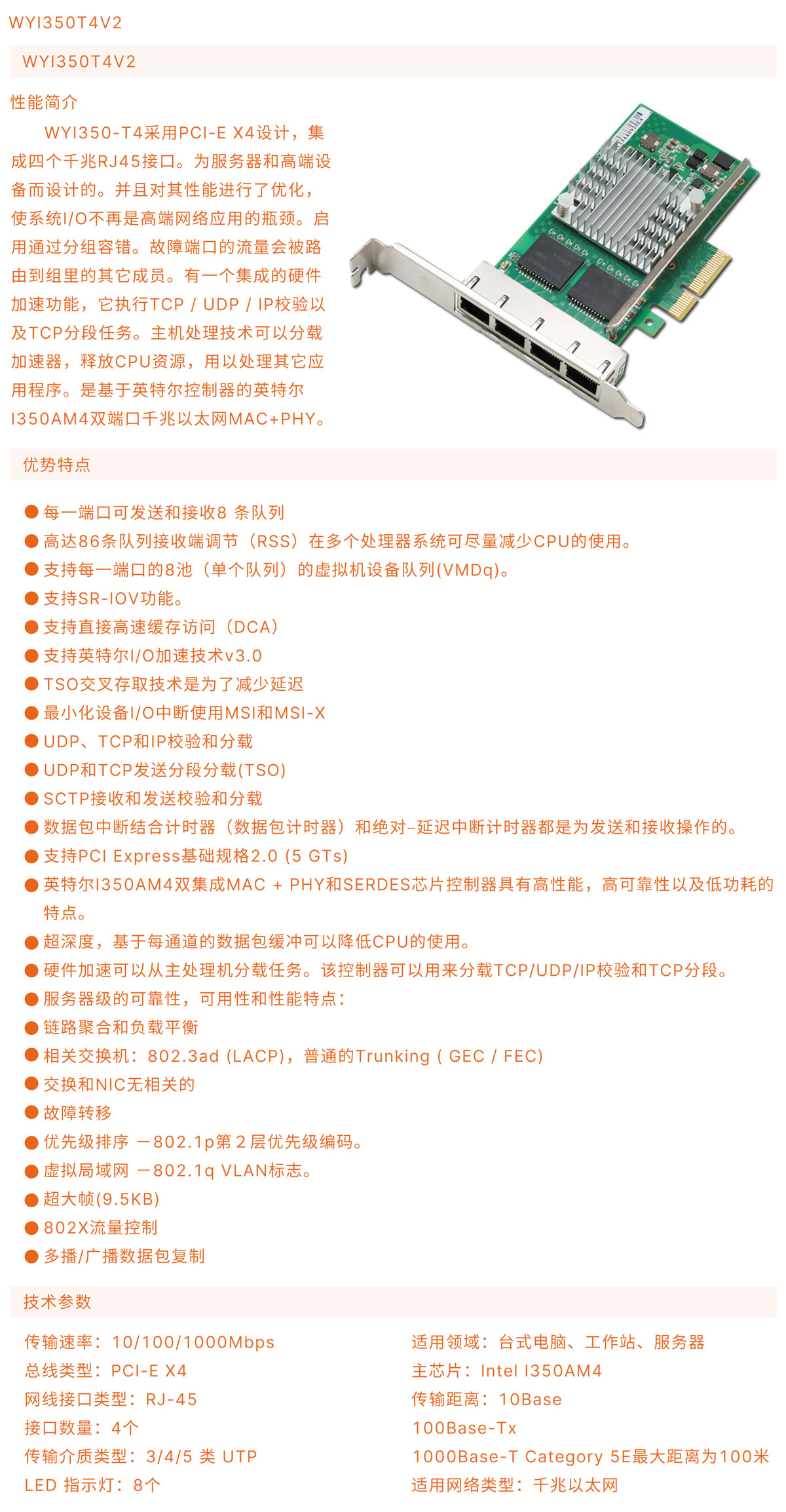 WYI350-T4采用PCI-E X4設(shè)計(jì),集成四個(gè)千兆R(shí)J45接口。為服務(wù)器和高端設(shè)備而設(shè)計(jì)的。并且對(duì)其性能進(jìn)行了優(yōu)化,使系統(tǒng)I/O不再是高端網(wǎng)絡(luò)應(yīng)用的瓶頸。啟用通過(guò)分組容錯(cuò)。故障端口的流量會(huì)被路由到組里的其它成員。有一個(gè)集成的硬件加速功能,它執(zhí)行TCP / UDP / IP校驗(yàn)以及TCP分段任務(wù)。主機(jī)處理技術(shù)可以分載加速器,釋放CPU資源,用以處理其它應(yīng)用程序。是基于英特爾控制器的英特爾I350AM4雙端口千兆以太網(wǎng)MAC+PHY。