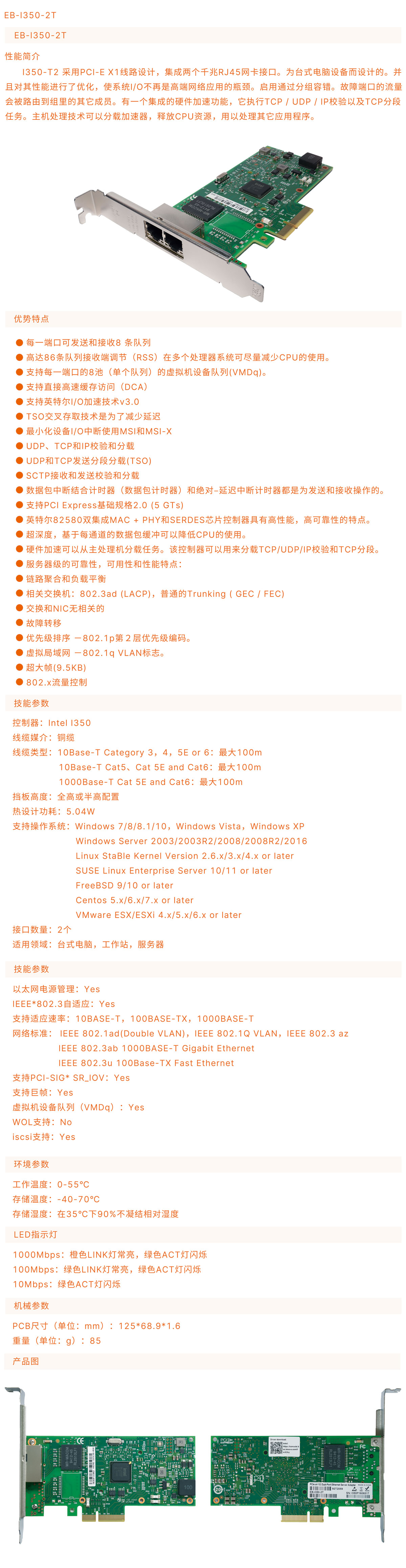 EB-I350-2T采用PCI-e X4線路設(shè)計(jì),集成兩個(gè)千兆R(shí)J45網(wǎng)卡接口。為臺(tái)式電腦設(shè)備而設(shè)計(jì)的。并且對(duì)其性能進(jìn)行了優(yōu)化,使系統(tǒng)I/0不再是高端網(wǎng)絡(luò)應(yīng)用的瓶頸。啟用通過分組容錯(cuò)。故障端口的流量會(huì)被路由到組里的其它成員。有一個(gè)集成的硬件加速功能,它執(zhí)行TCP/UDP/IP校驗(yàn)以及TCP分段任務(wù)。主機(jī)處理技術(shù)可以分載加速器,釋放CPU資源,用以處理其它應(yīng)用程序。